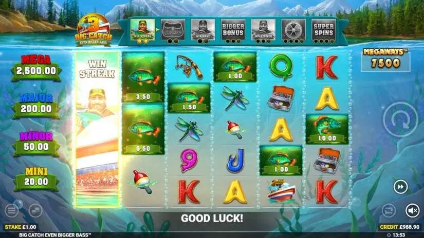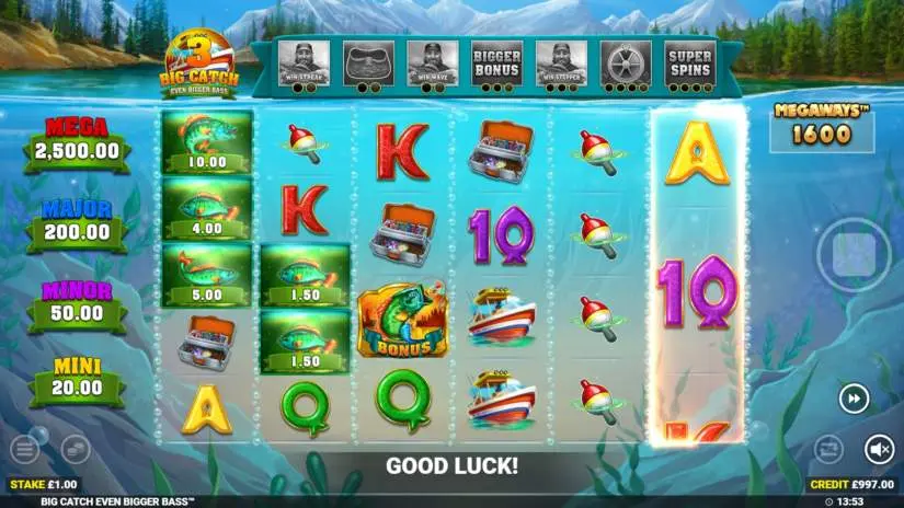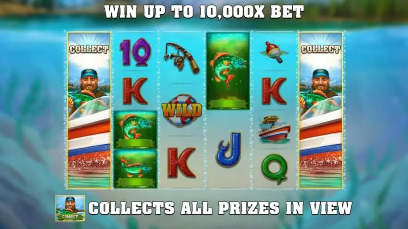 Wild substitutes for all symbols in Blueprint Gaming’s Big Catch Even Bigger Bass 3 except for the bonus scatter, collect scatters and cash prize symbols. Wild symbols can only appear on reels 2, 3, 4, 5 and 6. Only the highest win for each winning combination is paid.