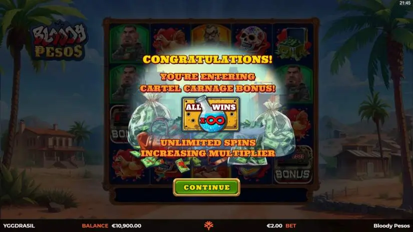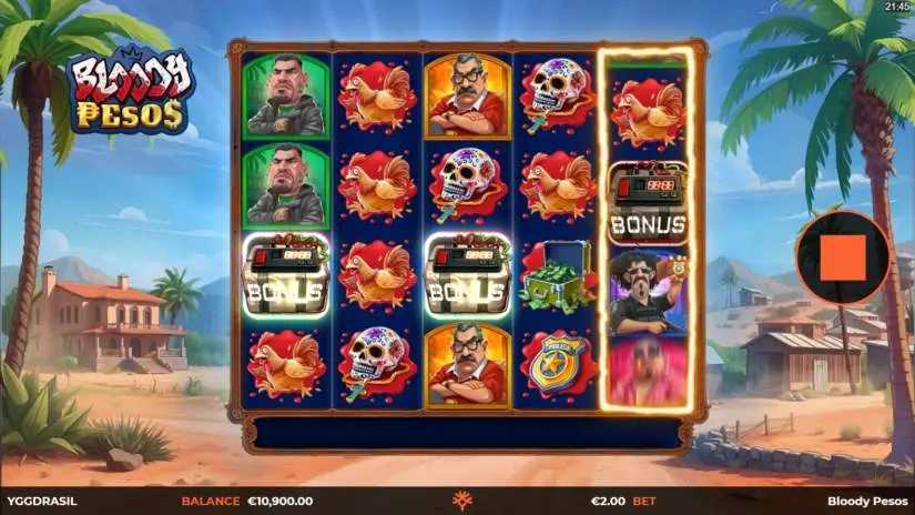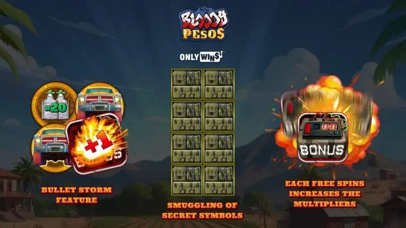 Welcome to the Bloody Pesos video slot from Yggdrasil Gaming, featuring Wild symbols, the Cartel Crackdown bonus, and the Secret Cargo features! The Secret Cargo feature has two sub-features: Smuggling and Revealing and Machine Gun Storm.