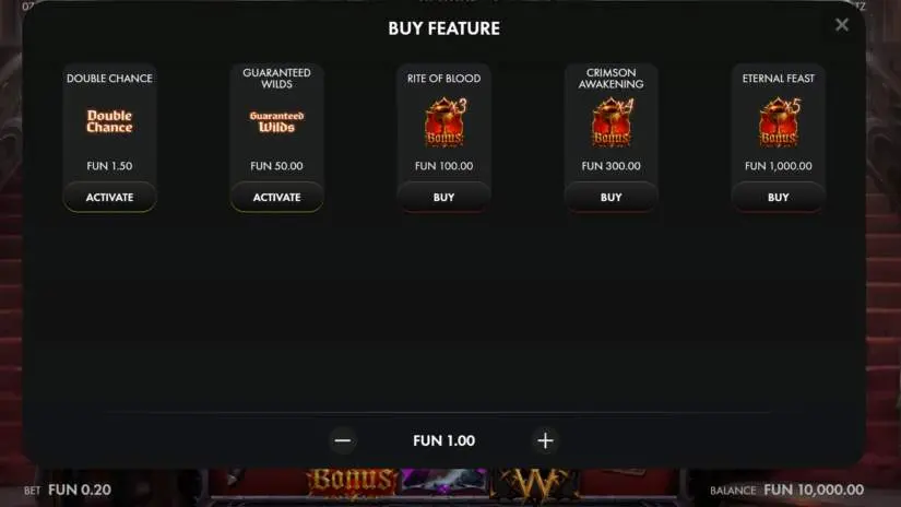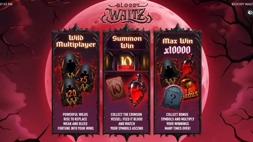 Think everything is going according to plan? Not at all—in the Bloody Waltz slot, you can take control of the masquerade. Unlock additional features, and you’ll be captivated by what you find. Double Chance—if you enjoy testing your nerves and triggering a bonus game almost randomly. Guaranteed Wilds—buy this feature to get up to 10 Wild symbols with multipliers up to x20. Just one spin, and you can win a maximum of x10,000. Love bonus games? Bloody Waltz offers three bonus round options, each with a different number of free spins and filled cups. Buy the main round or start with the basic one—the choice is yours.