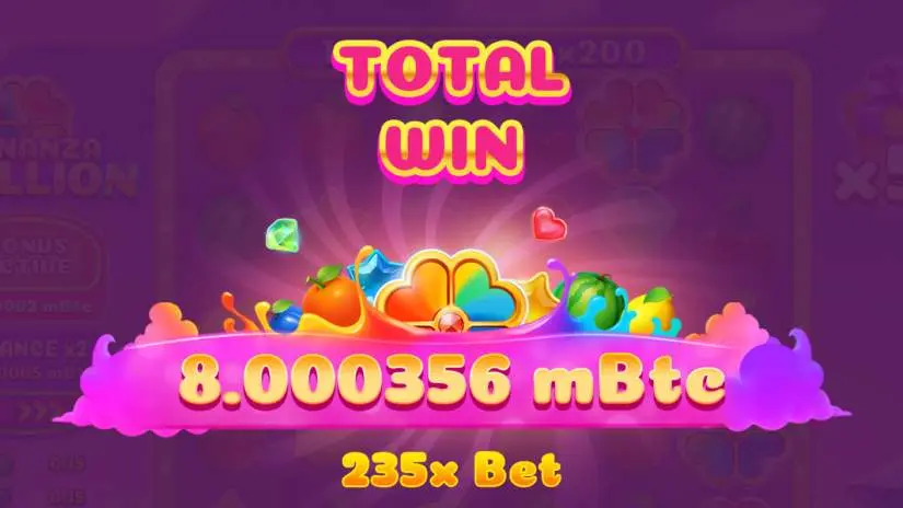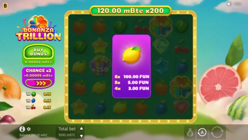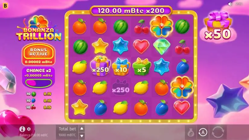 Bonanza Trillion slot from BGaming embodies the essence of summer, as it is full of juicy fruits, delicious berries and sunny gems. Spin the reels and dive into a whirlwind of tropical flavors and exciting wins! Symbols bring wins in any position and burst, giving way to new ones. So get ready for back-to-back wins! And there are multiplier symbols – they accumulate during free spins, multiplying your winnings many times!