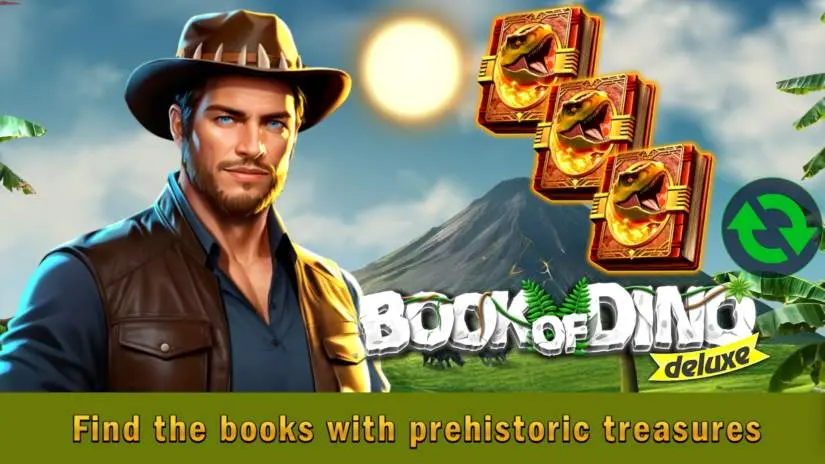 Book of Dino Deluxe is a 5-reel, 3-row slot from Swintt. The Scatter symbol also acts as a Wild symbol, substituting for all other symbols except the Lucky Symbol. Three or more Scatter symbols trigger 10 Free Spins.