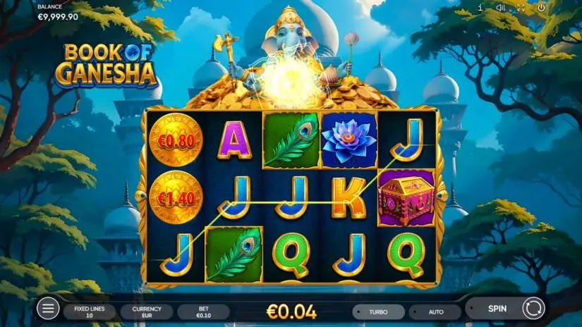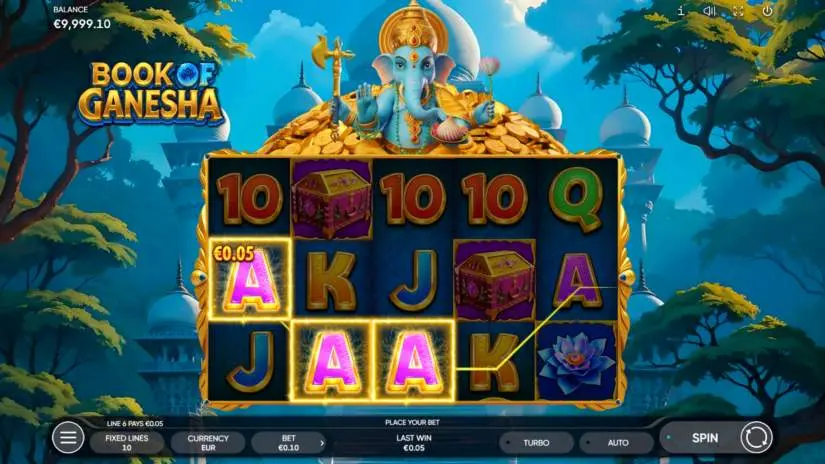 Book of Ganesha is a 5-reel, 3-row, 10-payline slot from Endorphina. All prizes are awarded for matching symbol combinations. Symbols, except for SCATTER symbols, must appear on active paylines and on adjacent reels, starting with the leftmost one. SCATTER symbols can be counted anywhere on the reels. Only the highest win is paid for the number of SCATTER symbols and combinations on each active line. Wins for SCATTER symbols and combinations on different lines are cumulative. All prizes in the paytable are displayed for the currently selected bet and number of paylines.
