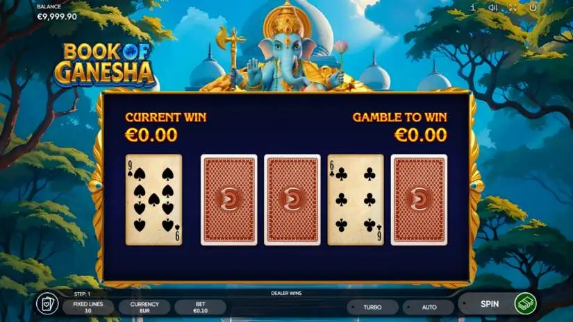 Don’t miss the chance to multiply your winnings in the Book of Ganesha slot! Choose one of four face-down cards. If you beat the dealer’s card, your winnings are doubled, and you can bet it again (maximum 10 attempts). If the dealer wins, you lose all your winnings, and the Risk Game ends. All face-down cards can be higher than the dealer’s card. All face-down cards can be lower than the dealer’s card. Cards can be repeated from round to round. The probability of receiving cards is unevenly distributed. The Joker beats any card. The Joker never gets the dealer’s card. If your card is equal to the dealer’s card, the game is a draw. Your winnings remain unchanged, and a new round begins. If you don’t want to risk, you can opt out and take your money. To do this, click the CLAIM button. The average return to player (RTP) for a Risk Game round is 84% (if you take risks, ignoring the dealer’s card). In each individual case, the probability of winning is higher or lower depending on the dealer’s card: