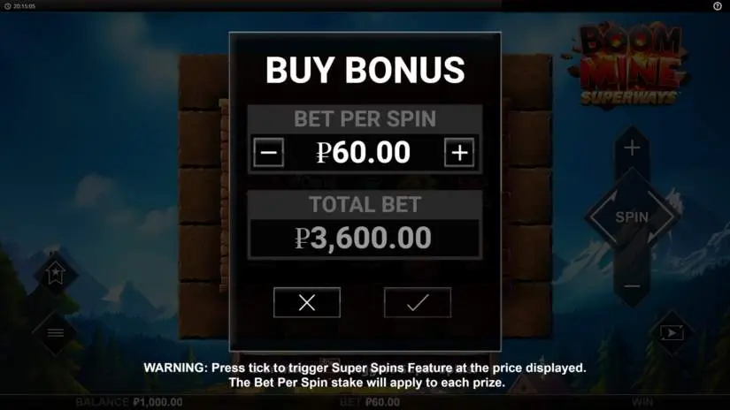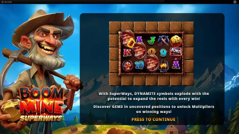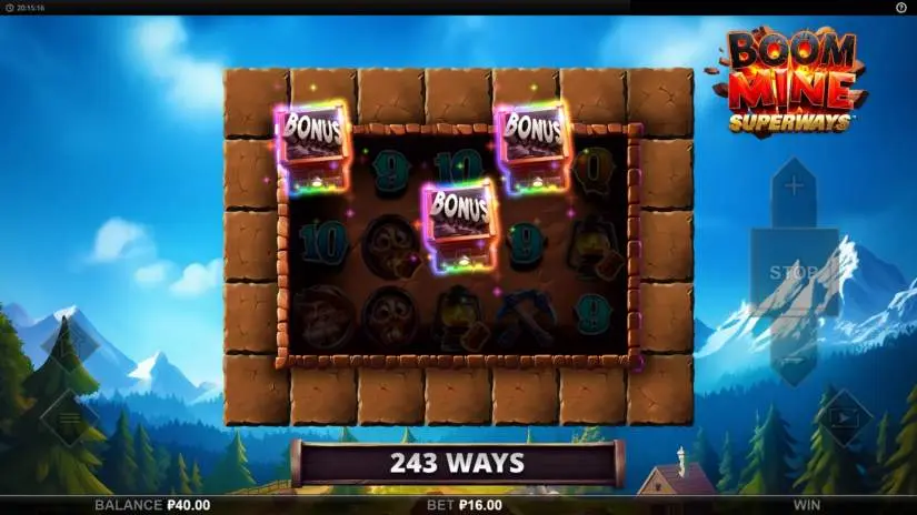 Select your total bet for the Boom Mine SuperWays spin with 243 ways to win. All wins start from the leftmost reel and pay out from left to right across adjacent reels. Each winning symbol (except the BONUS) explodes and is replaced by symbols falling from above. Matching wins are added together. The highest win of a winning combination is paid. All wins are listed in the paytable for the selected bet. Any error will void all results and payouts.