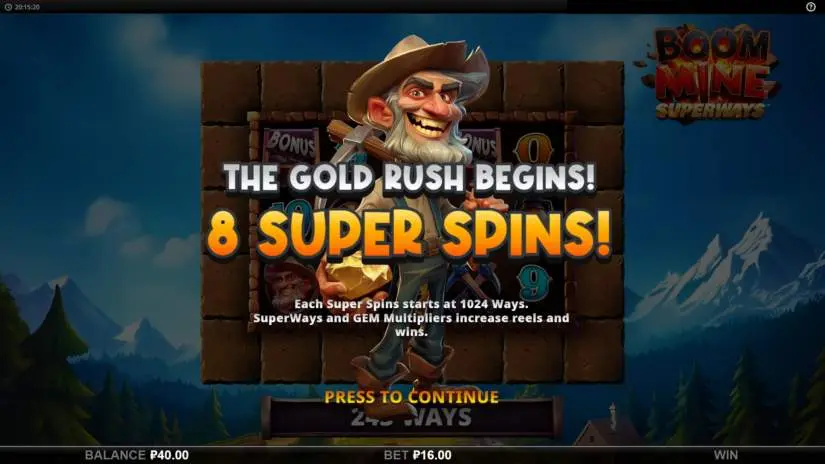 Each Super Spin starts with 1024 ways to win. Super Spins are played with the same bet as the spin that triggered them. Super Spins can award SuperWays cascades and GEM Multipliers. The BONUS symbol does not appear during Super Spins. The Super Spins round cannot be retriggered.