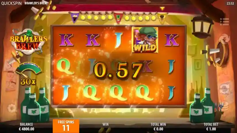 If a WILD symbol appears on the reels, a LUCKY UPGRADE can occur! The Leprechaun will then transform one or more low-level symbols and replace them with BREW. The BRAWLER will then take the BREW. This feature is randomly activated in the main game. Line wins are not calculated during a respin.