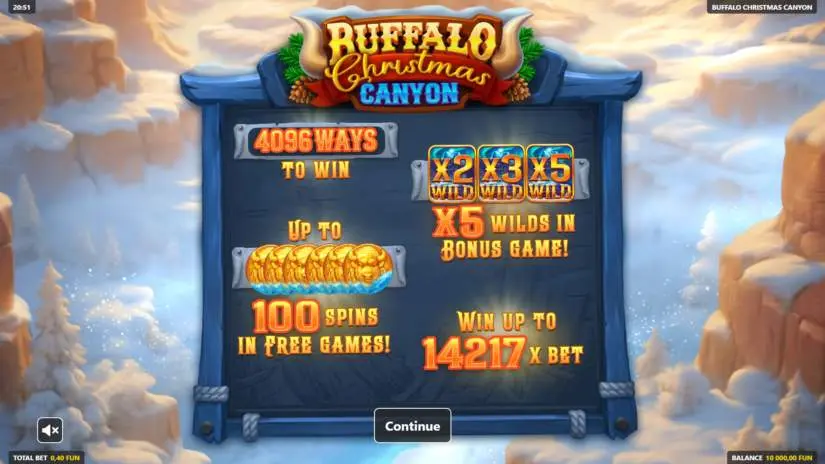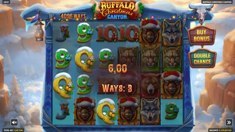 The maximum win in Buffalo Christmas Canyon is capped at 14217x the bet. At the current bet, the maximum win is 5,686.80 FUN.