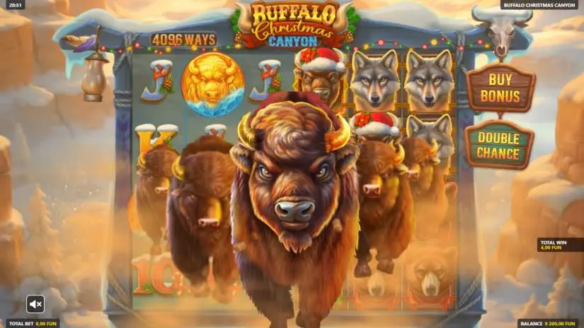 Buffalo Christmas Canyon is a 6-reel, 4-row video slot with a BONUS game. During the regular game, the goal is to land a winning combination of symbols using any of the winning modes. The winning amount depends on the bet size and the winning symbol combinations.