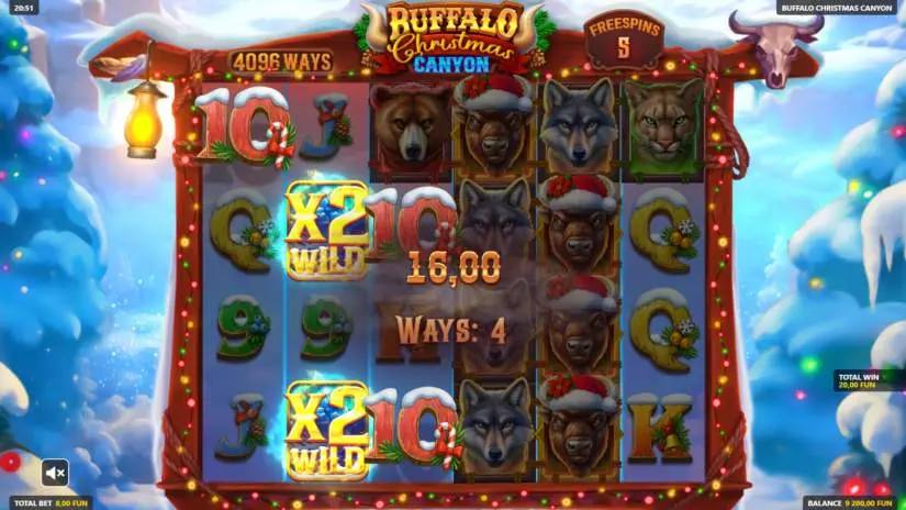 The Buffalo Christmas Canyon slot offers 4096 ways to win. Wins are calculated by multiplying the symbol value in the paytable by the number of ways the symbols win. A winning combination of identical symbols pays left to right on adjacent reels. A malfunction clears all wins.