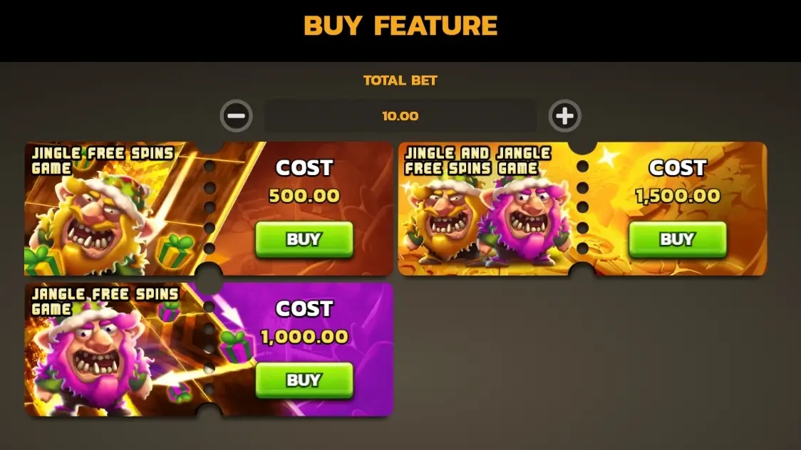 During the main game, Jingle symbols may randomly trigger, appear on the reels, and create stacked columns of coins.