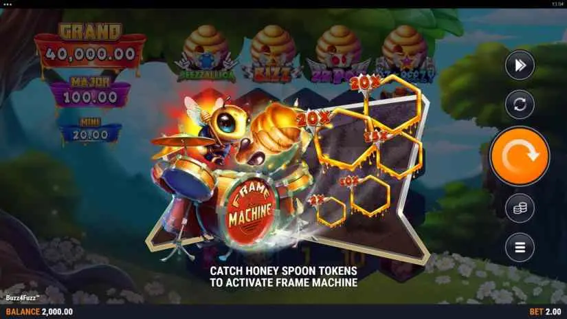 There are 4 bonus games available: BEEZZALLICA, BIZZ, ZZ POT and AZ BEEZY. Every time you collect a Fuzz coin, there is a chance to trigger a bonus game. Green, red, purple and blue Fuzz coins are collected in the corresponding hives at the top.