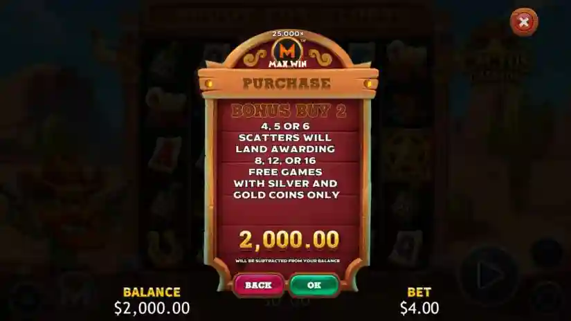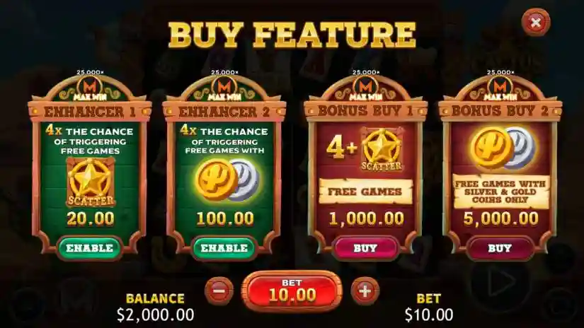 By paying 10x the bet, the player gets 4 times the chance to trigger free spins using only silver and gold coins. The maximum win is 50,000x the bet. The theoretical RTP for this game mode is 96.62%.