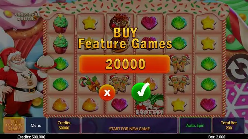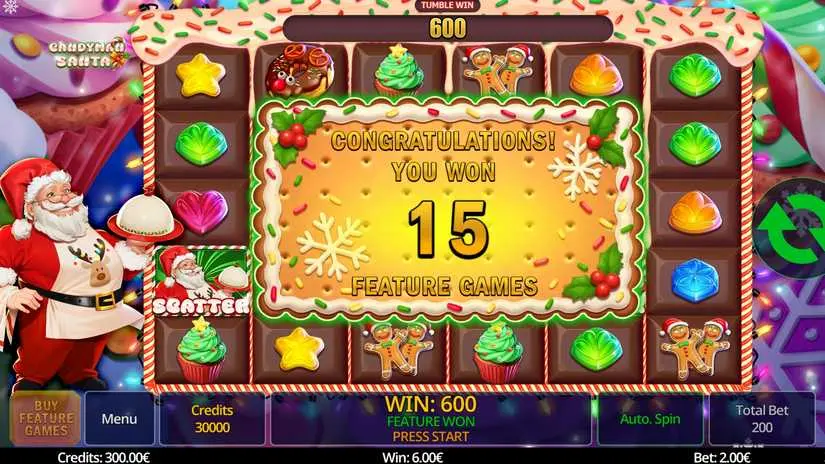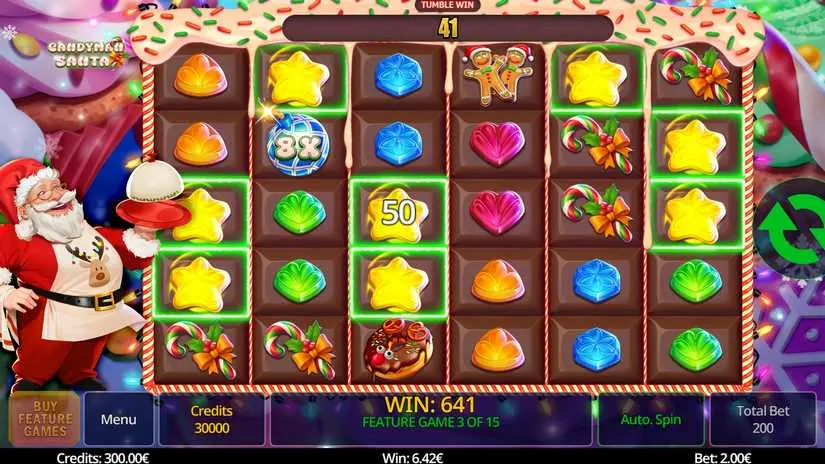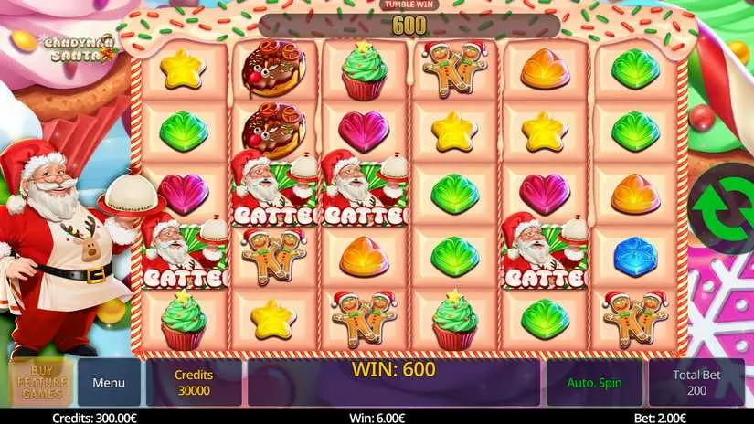 Candyman Santa™ is a 6-reel, 5-row slot from Swintt. 4 or more Scatter symbols trigger 15 Free Spins.