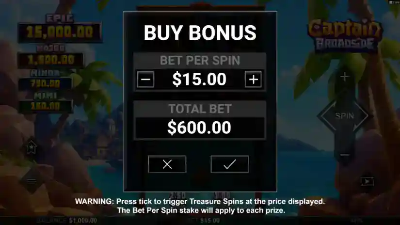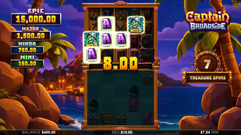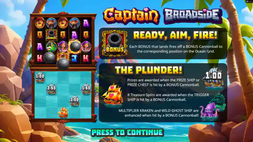 Welcome to the Captain Broadside slot game from Hot Rise Games! All wins occur on 40 paylines. Wins start on the leftmost reel and pay out from left to right across adjacent reels. Average theoretical return to player (RTP):