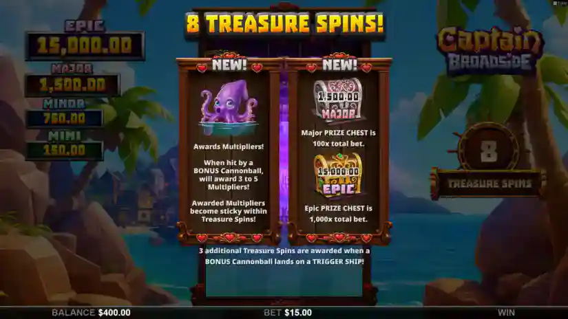 If a BONUS cannonball lands on an ACTIVATOR SHIP in the main game, 8 Trophy Spins are awarded. PRIZE SHIPS, PRIZE CHESTS, WILD GHOST SHIP, MULTIPLIER KRAKEN, and the ACTIVATOR SHIP are active on the ocean board during Trophy Spins. MULTIPLIERS on the symbol board persist until the end of the Trophy Spins round. 3 additional Trophy Spins are awarded when a BONUS cannonball lands on an ACTIVATOR SHIP during Trophy Spins. A maximum of 1 Epic PRIZE CHEST and 1 Major PRIZE CHEST can appear in each Trophy Spin. A maximum of 1 Epic PRIZE CHEST and 1 Major PRIZE CHEST can be won during Trophy Spins.
