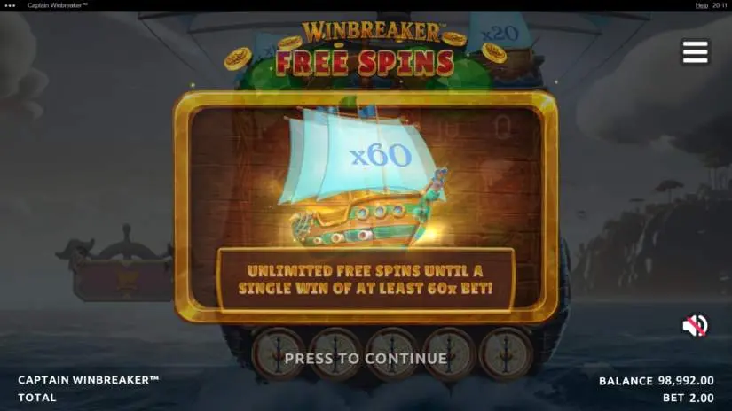 Locating 2 Scatter symbols adds 1 token to the Win Breaker™ meter. The current Win Breaker™ value is displayed in the left boat of the Win Breaker™ meter. Collect 25 tokens to fill the Win Breaker™ meter and earn a new Win Breaker™ value in the right boat. When a new Win Breaker™ value is reached, the next Win Breaker™ value increases by 10. The minimum Win Breaker™ value is 10x. There is no maximum Win Breaker™ value. The Win Breaker™ meter resets when a new Win Breaker™ value is reached. A Win Breaker™ value is reset when used in Free Spins. The Win Breaker™ meter’s progress is saved for each bet.