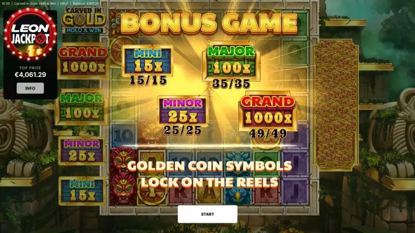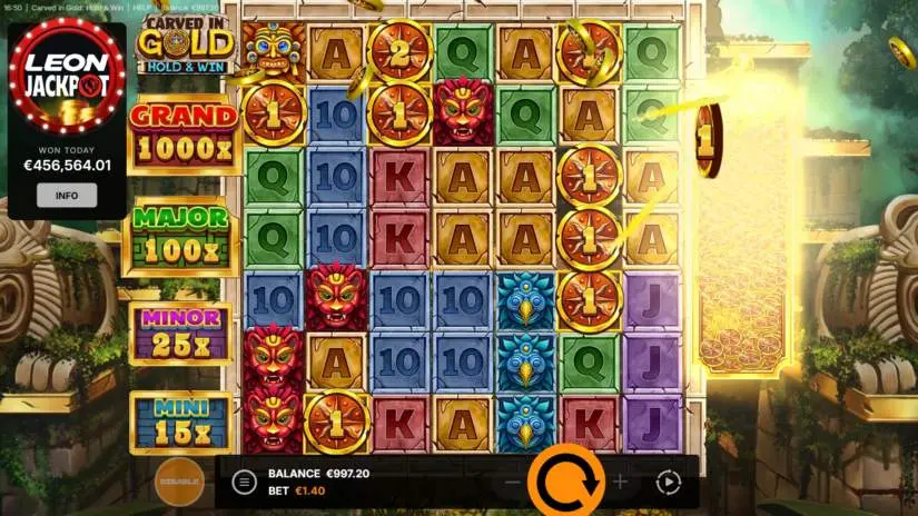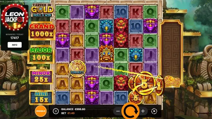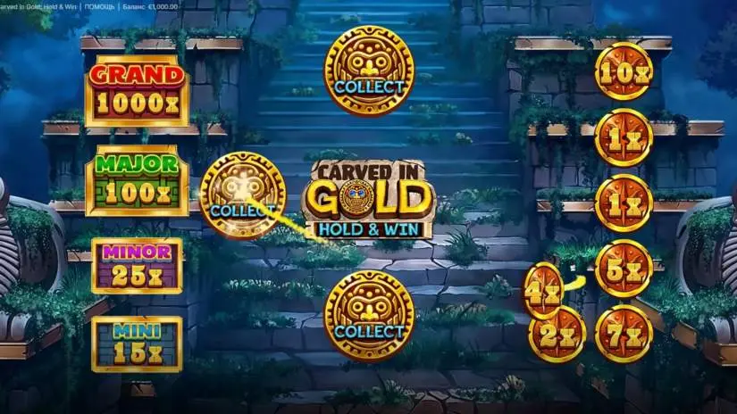 The winning amount in Carved in Gold: Hold & Win is determined by the total number of identical linked symbols on the screen, located adjacent to each other horizontally and vertically. After each spin, all winning combinations are paid and removed from the reels. The remaining symbols then fall to the bottom, and the empty spaces are filled with new symbols.