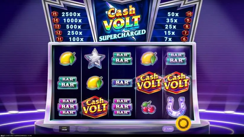 Landing one VOLT SPINS symbol and one SUPERCHARGED VOLT SPINS symbol on reels 1 and 5 triggers three SUPERCHARGED SPINS symbols in the Hold and Re-Spin round. At the start of the bonus round, VOLT SPINS and SUPERCHARGED VOLT SPINS symbols clone, covering the entire reel and transforming into CASH VOLT symbols. During SUPERCHARGED SPINS, only SUPERCHARGED CASH VOLT symbols can land on the reels. Landed CASH VOLT symbols and any new CASH VOLT symbols are locked for the duration of the bonus round. Landing a new SUPERCHARGED CASH VOLT symbol resets the number of spins to 3. The bonus round ends if no SUPERCHARGED CASH VOLT symbols land for 3 consecutive spins or if all reel positions are filled with locked symbols. At the end of SUPERCHARGED SPINS, an instant win is paid out equal to the number of CASH VOLT scatter symbols on the reels.
