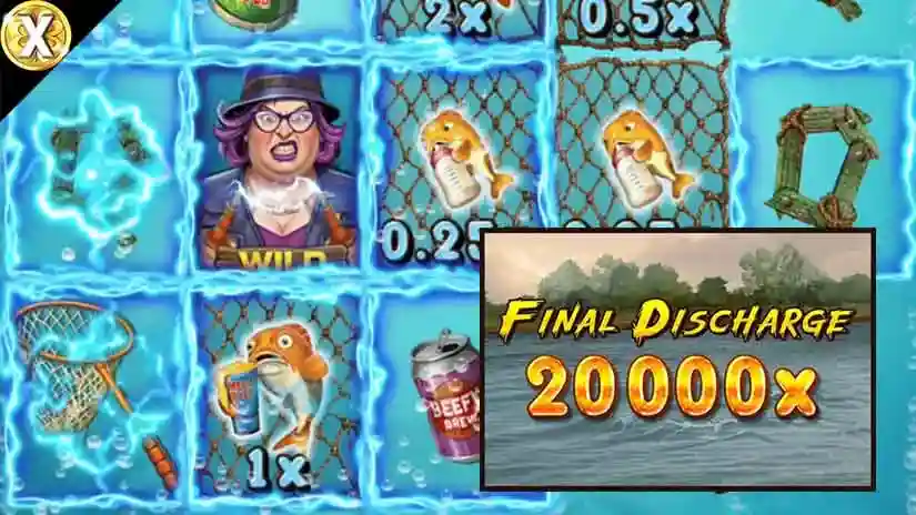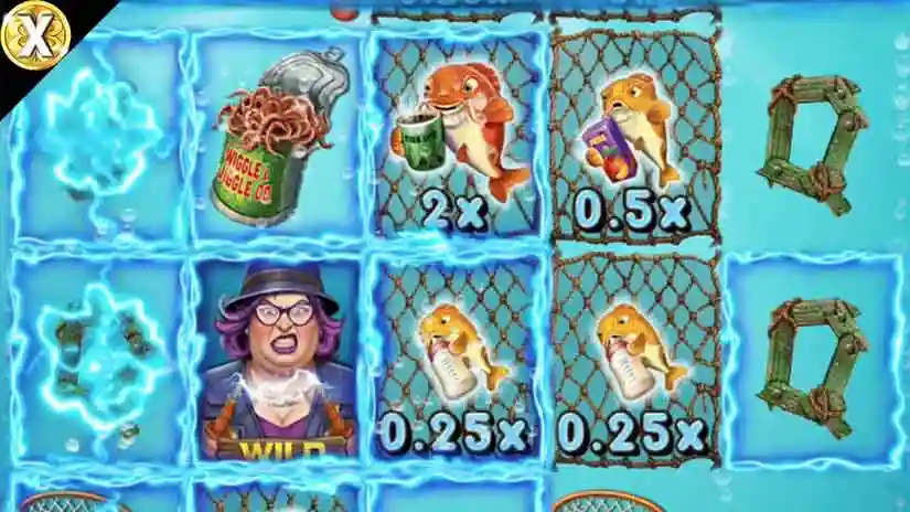 Fish symbols can appear on the reels, and each fish has an associated value. A fish win is awarded when an Electrical Frame symbol appears in the position of a fish symbol. The global fish multiplier starts at x1 and is applied to the fish value, then multiplied by the base bet.