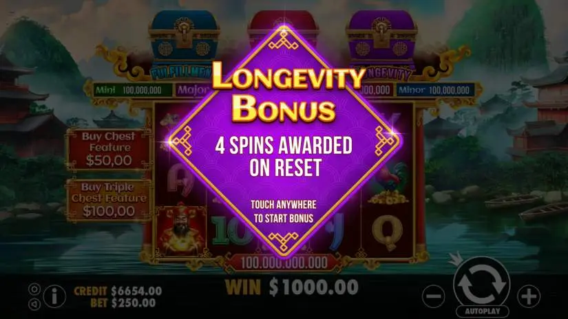 If the round was randomly triggered with the LONGEVITY modifier, the CHEST RE-SPIN feature starts with 4 re-spins instead of 3, 3, and each MONEY symbol that appears resets the number of re-spins back to 4.