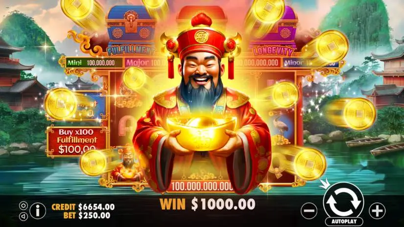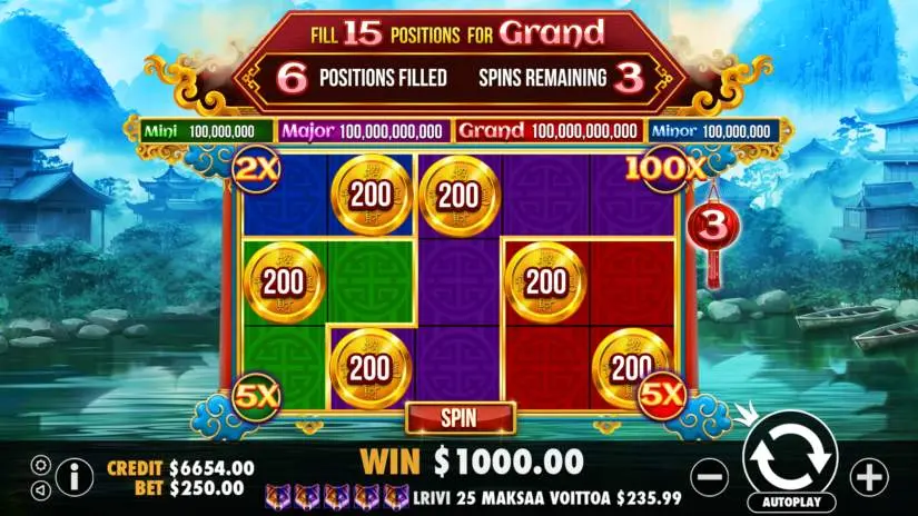 Explore a quiet Chinese village in Chests of Cai Shen 2, where multicolored coins randomly trigger a bonus game with a re-spin and unique modifiers. Modifiers include an additional 5×3 grid, an additional re-spin, and the assignment of four grid positions with multipliers up to x100. One, two, or all three modifiers can be triggered simultaneously. During this feature, sticky money symbols reset the number of re-spins, awarding a win at the end of the round and an additional x15,000 if all grid positions are filled. All symbols in Chests of Cai Shen 2 by Pragmatic Play pay from left to right on adjacent reels, starting with the leftmost reel.