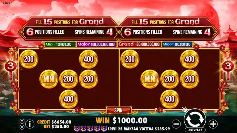 The round ends when the player has no more re-spins remaining or when all the positions on the screen are filled with MONEY symbols. If all positions are filled with MONEY symbols, a GRAND prize (5000x the total bet) is also awarded.