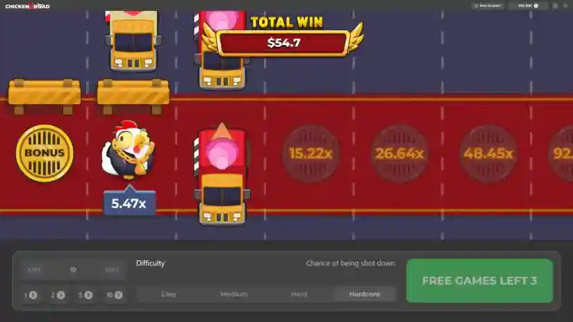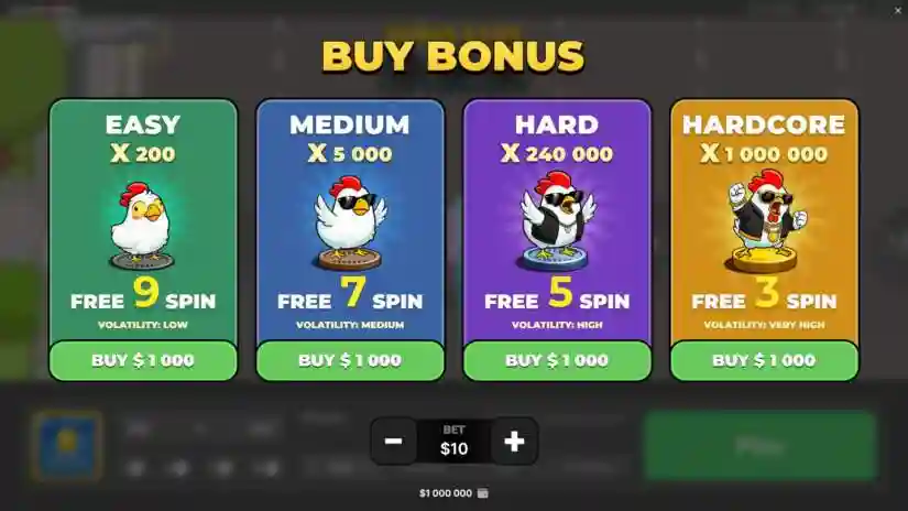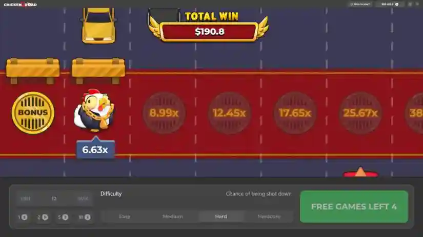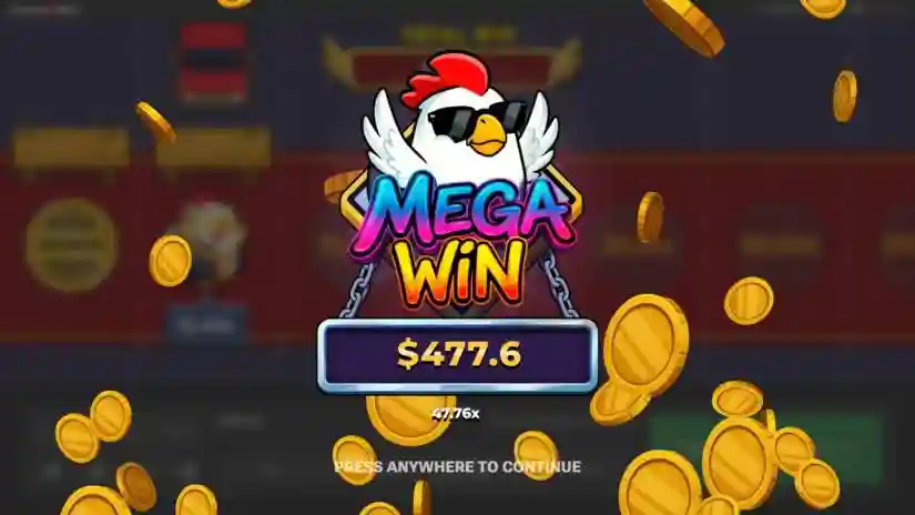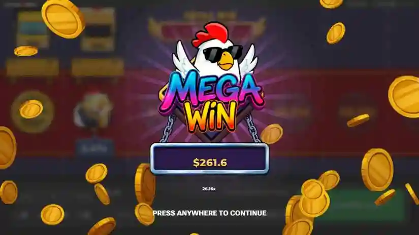 During the bonus, the chicken automatically stops one step short of danger on each spin, reaching the maximum multiplier. After all free spins are completed, the accumulated multiplier is automatically paid out.