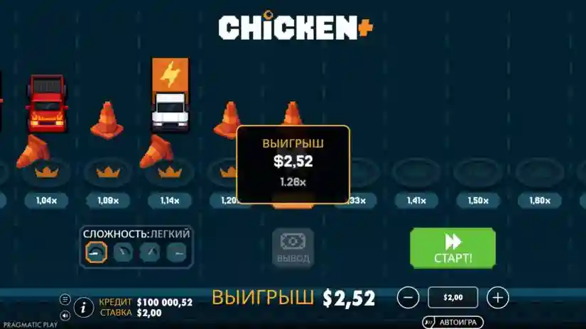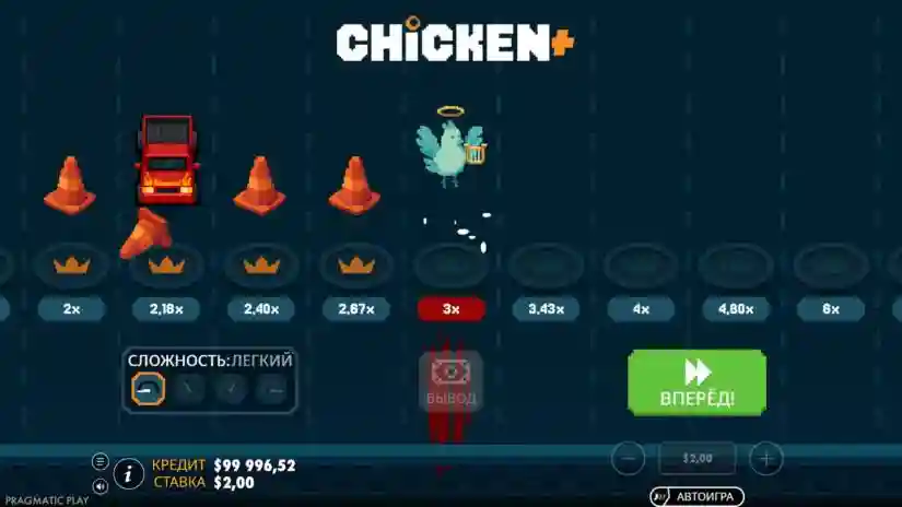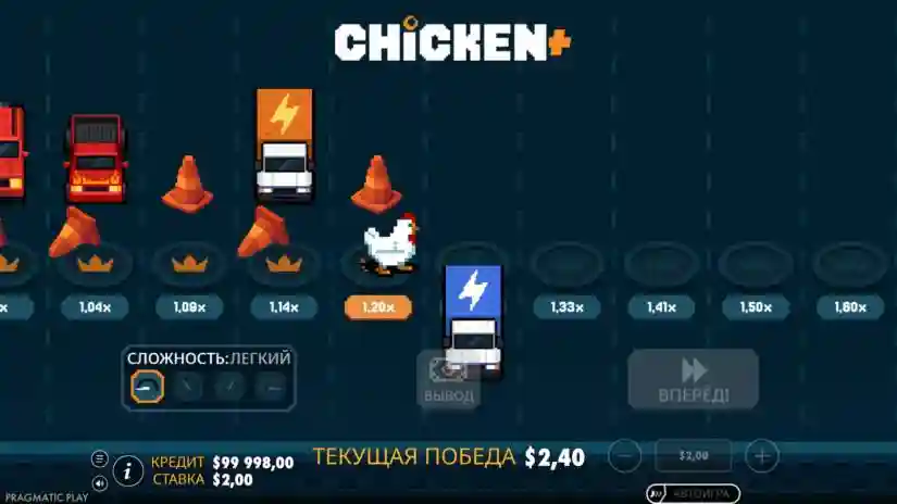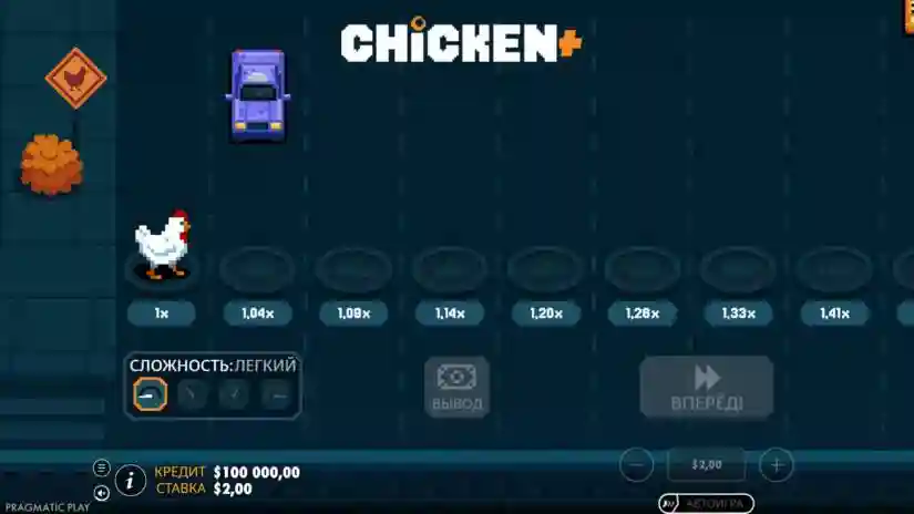 The current bet multiplier is indicated under each lane. If the player chooses to move to the next lane, the chicken may either successfully cross it or fail—the outcome is determined randomly. If the chicken successfully crosses a lane, the current win is multiplied by the new lane’s multiplier. The player can then either collect the winnings or continue moving. If the chicken fails to cross a lane, the round ends without a win.