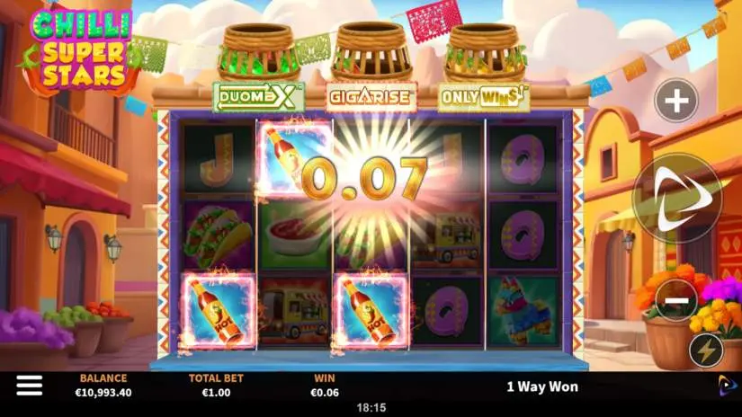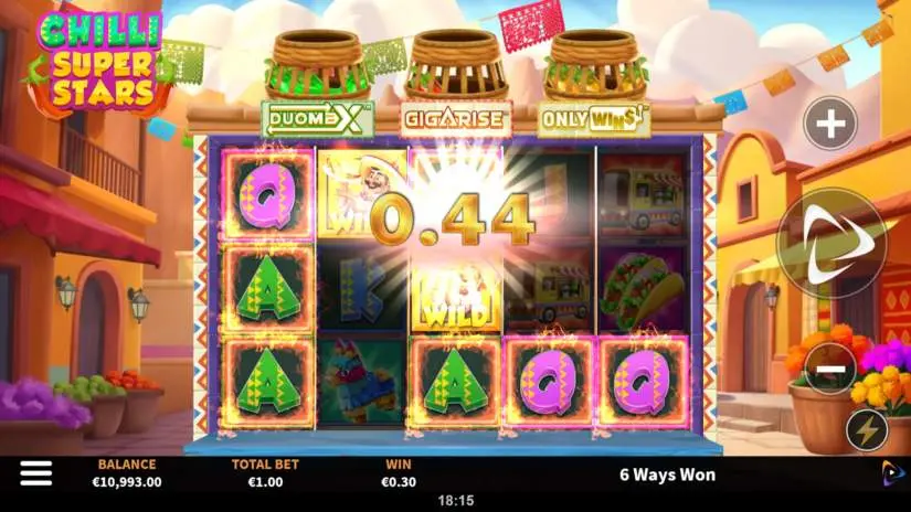 The player selects the Total Bet size to play 243 ways in Chilli Super Stars. Payouts are determined according to the paytable. Matching wins are added together. The highest win in a winning combination is paid. When the DUOMAX feature is inactive, all wins begin on the leftmost reel and are paid from left to right on consecutive reels. Each symbol can only be used once in a winning combination. The “WILD” symbol substitutes for all symbols except the “BONUS SCATTER.” The WILD symbol appears only on reels 2, 3, and 4. In the event of a failure, all spins and payouts are void.