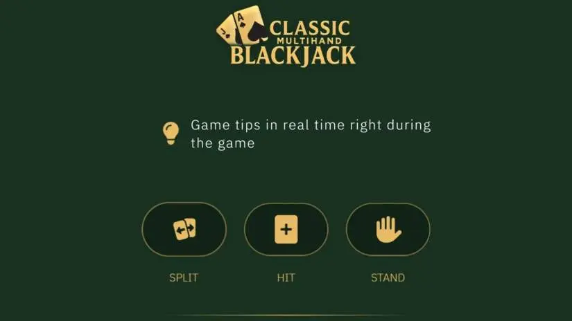 To navigate these options more efficiently, you can turn on the hints by clicking the light bulb button. When activated, the hints will indicate the best option for your current hand. However, the hints are only available for two-card hands and do not include any bet increase recommendations. They are limited to action hints such as “Take another card”, “Stand”, or “Split”, with the exception of doubling down.