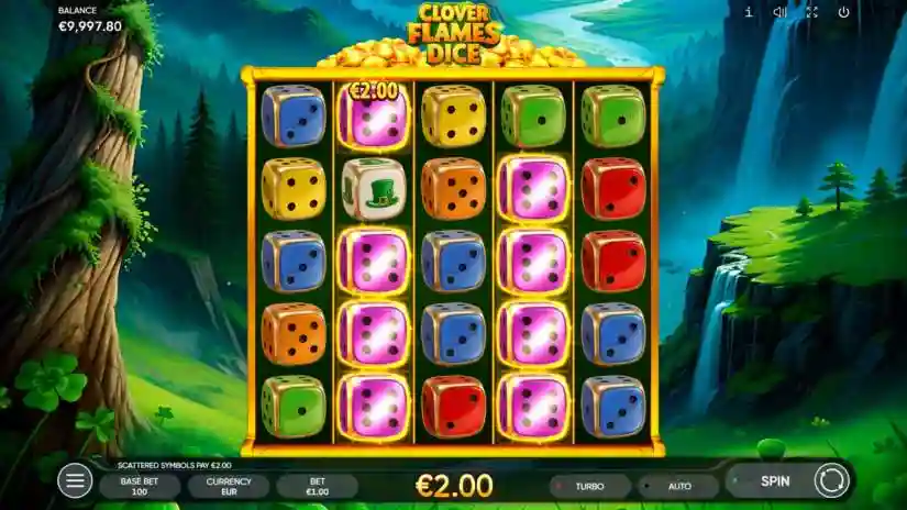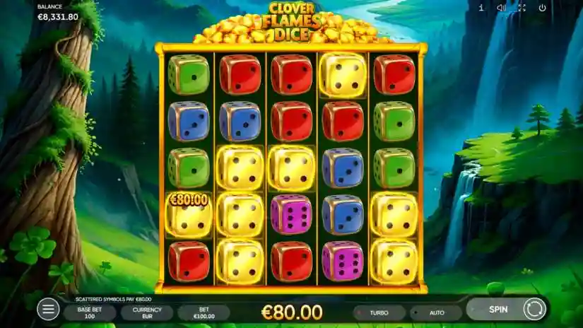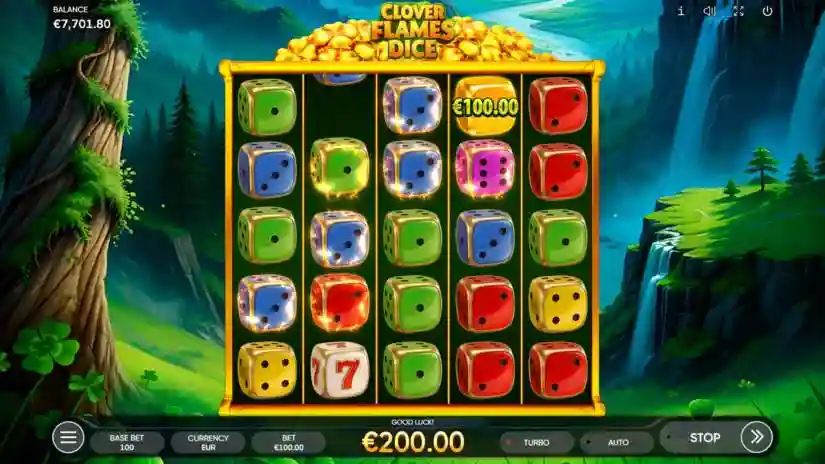 CLOVER FLAMES DICE is a cascading symbol slot, where all symbols are randomly scattered: their position on the reels doesn’t matter, only their number.