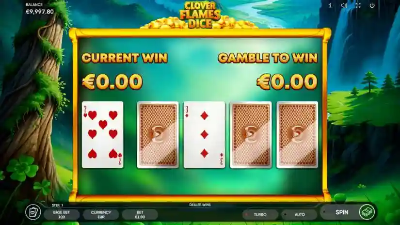 Don’t miss your chance to multiply your winnings in the Clover Flames Dice slot! Choose one of four face-down cards. If you beat the dealer’s card, your winnings are doubled, and you can bet it again (maximum 10 times). If the dealer wins, you lose all your winnings, and the Risk Game ends.