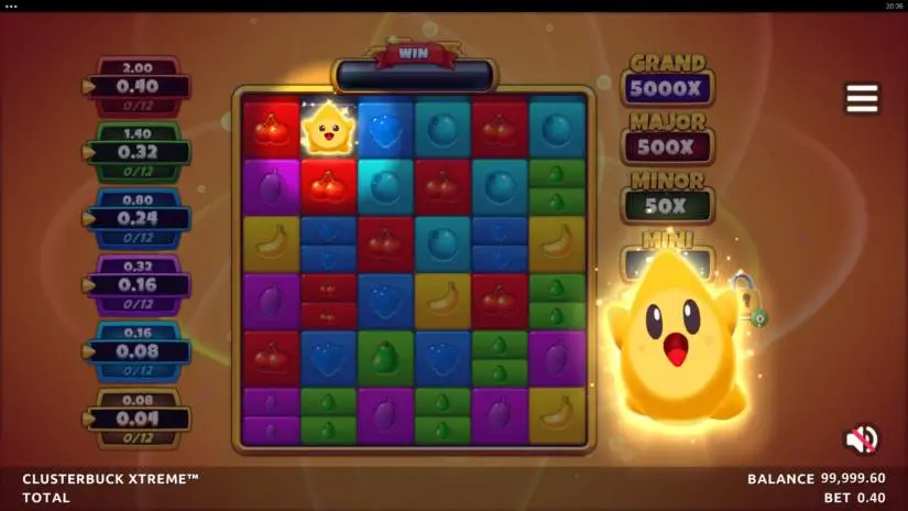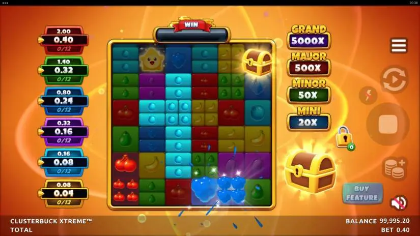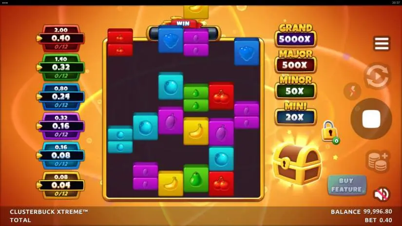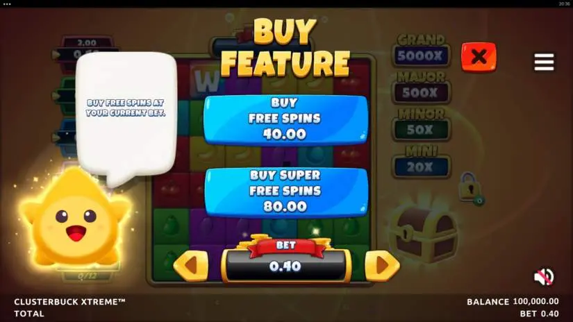 Cluster wins in ClusterBuck Xtreme are paid out at the initial bet. The payout amount depends on the completion of levels in the Cluster Panel. A win is awarded when clusters complete a level in the Cluster Panel. The paytable displays the payout level for each cluster symbol based on the current bet. The total payout is the sum of all multi-level wins that occurred during a spin. The feature or game ends when the maximum win is reached. Once the win limit is reached, only the limit amount is paid out, and any remaining prizes are forfeited. The win limit does not apply to wins in the main game, but only to wins from the “Buy Bonus” feature. A win limit may apply in certain regulatory regions. The maximum possible win value is rounded down. This is the approximate maximum amount that can be won in a single spin.