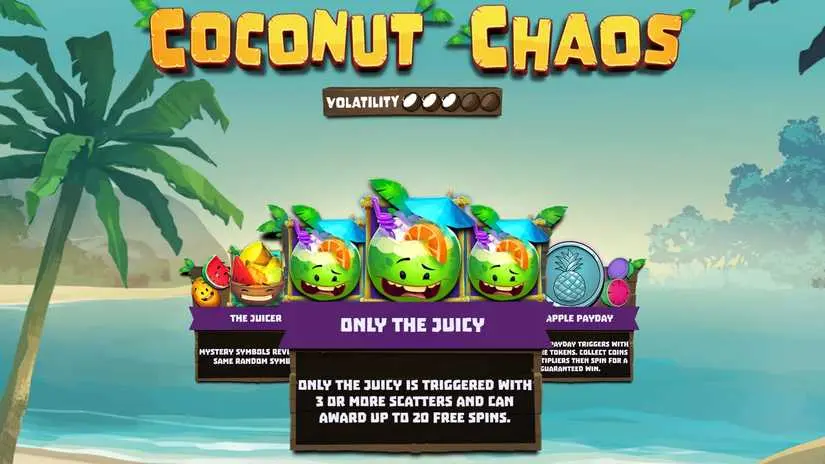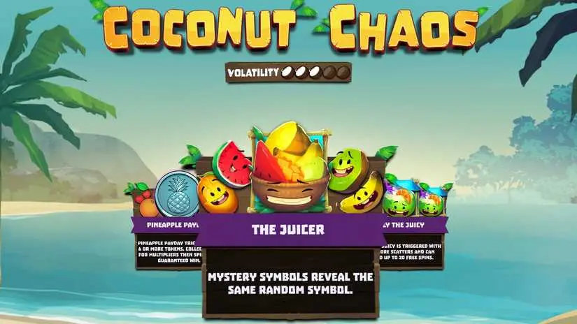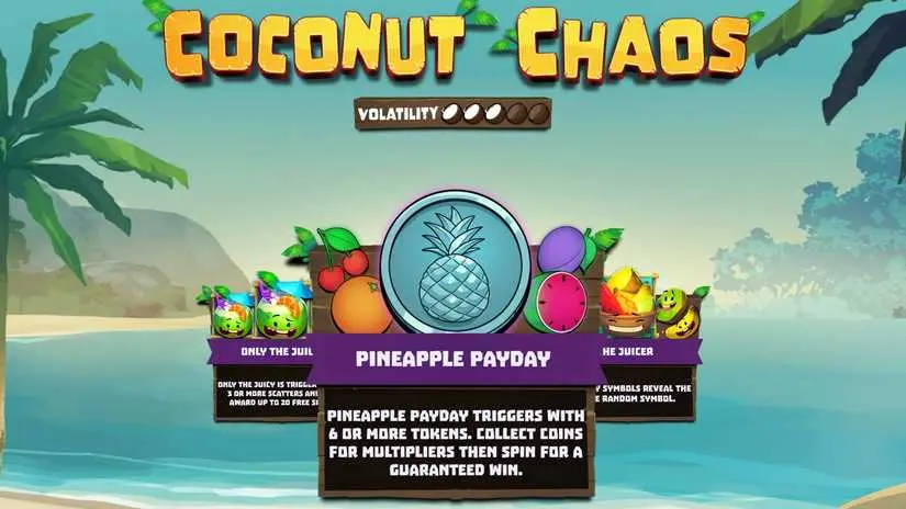 Coconut Chaos is a 5-reel, 4-row, 4-payline slot from Pineapple Play and Hacksaw Gaming featuring Mystery symbols, Scatters, and two exciting bonus games.