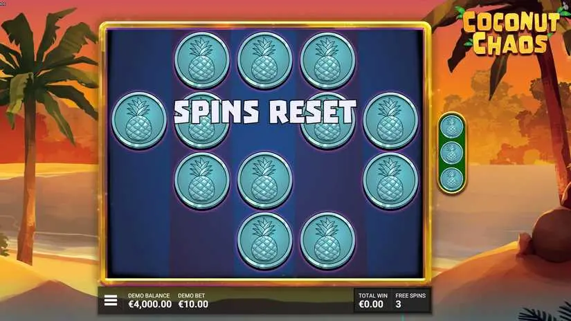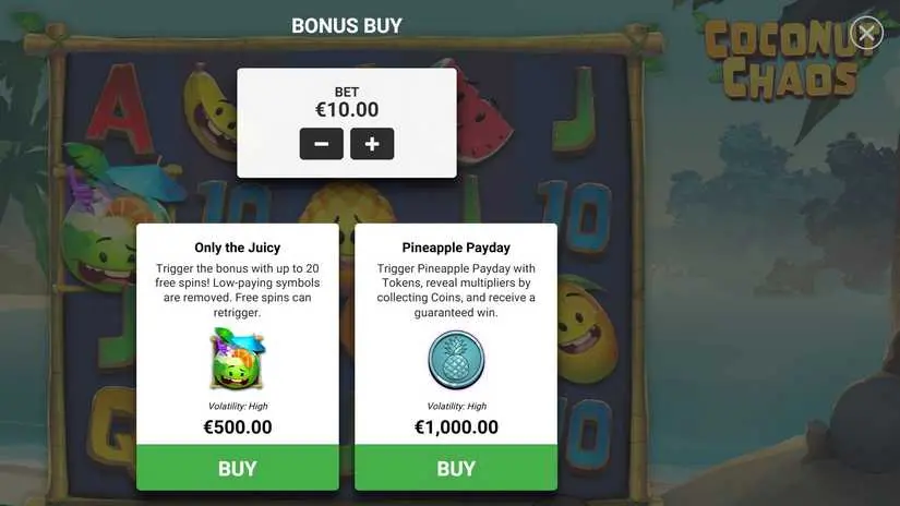 The maximum win in Coconut Chaos is 10,000 times the current bet level. The maximum win can be achieved by activating certain combinations and/or features.