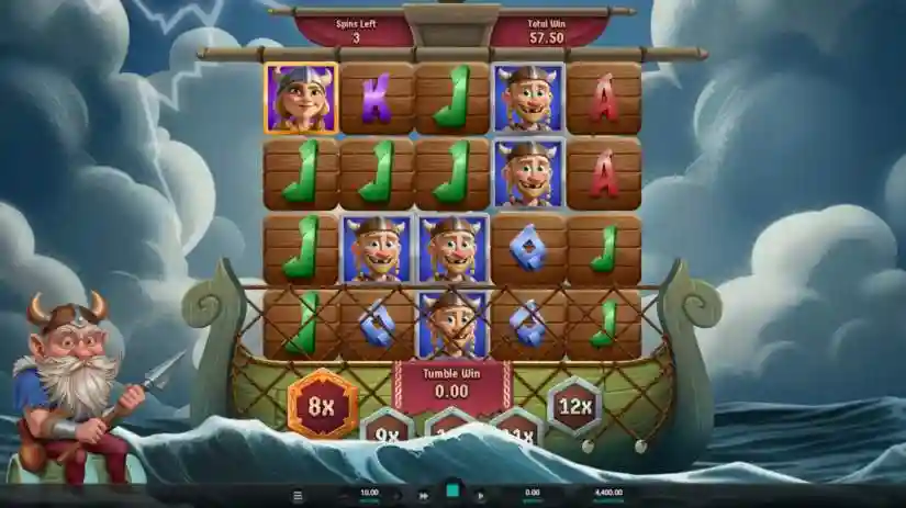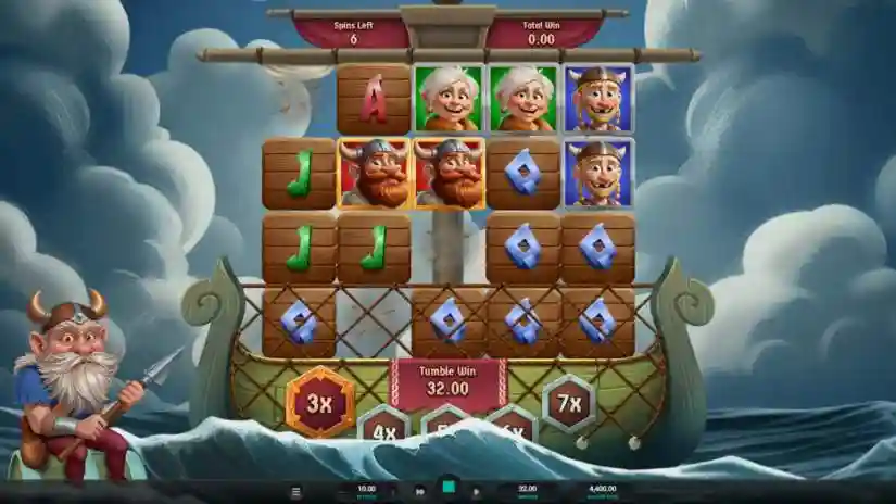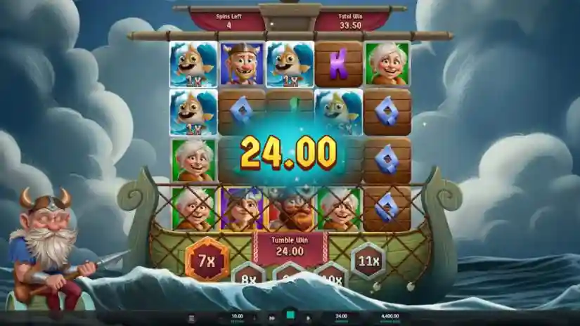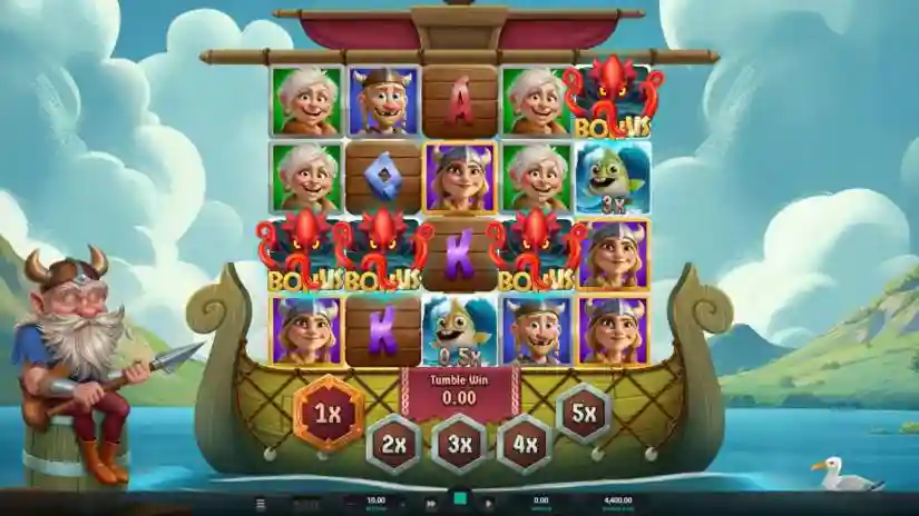Multiple matching symbols on a reel multiply the win. Winning combinations and payouts are determined according to the paytable. In the main game and free spins mode, the Wild symbol substitutes for all symbols (except fish and bonus symbols) on the reels when calculating wins. Fish symbols can be collected randomly by the Viking fisherman. Catching a fish can result in a win.