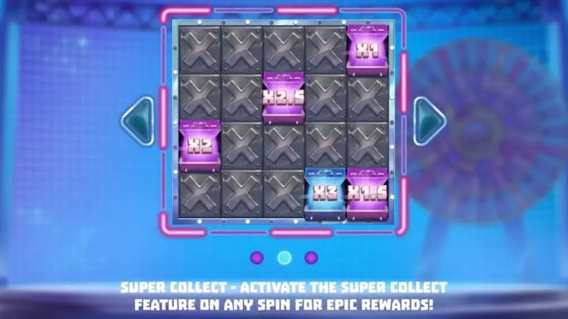 The Super Collection round can randomly trigger before the regular base game round. In the “Collection” round, only value symbols and empty symbols appear. The multiplier ranges for the reels are: 1x-2.5x, 3x-5.5x, 6x-9x, 10x-14.5x, 15x-30x.