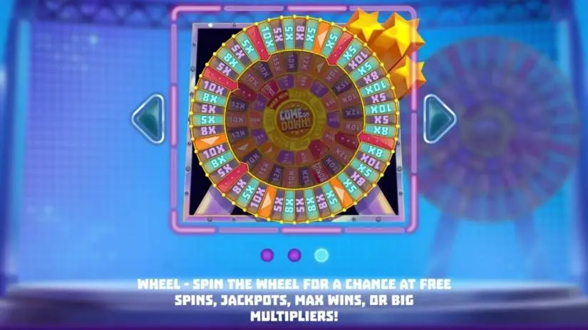 Landing 3 Wheel symbols in the main game triggers the Wheel round. Wheel symbols appear only on reels 2, 3, and 4. There are 4 Wheel levels, each with higher prizes or re-spins.