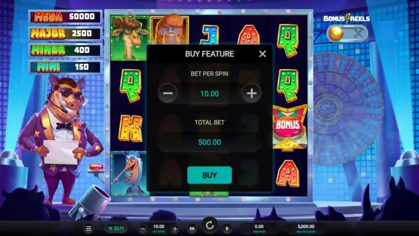 The theoretical RTP (return to player) for the bonus bet is 94.50%. The “Buy Feature” is played at odds of 50x your regular bet. Activating the “Buy Feature” guarantees three bonus symbols landing and entry into the free spins round.