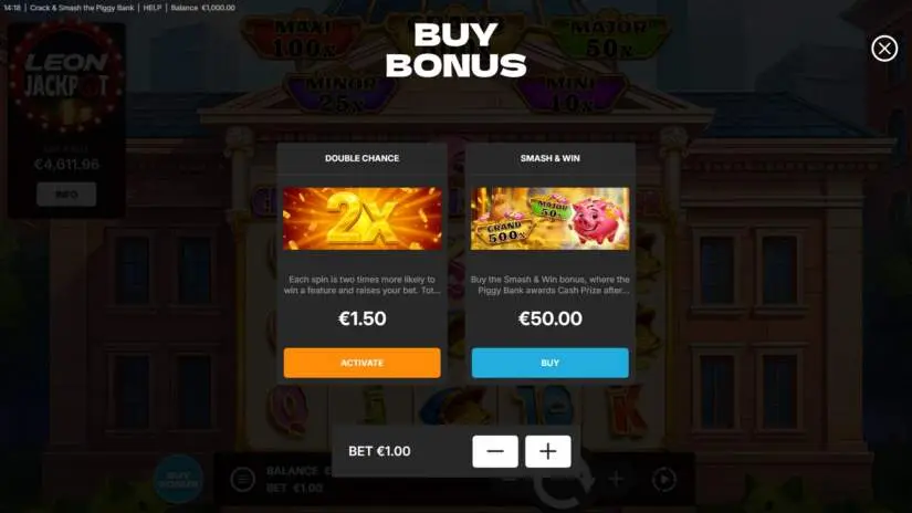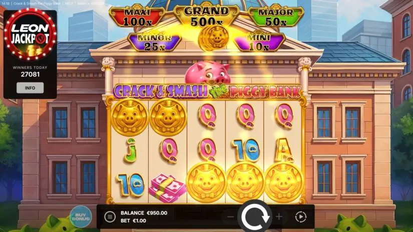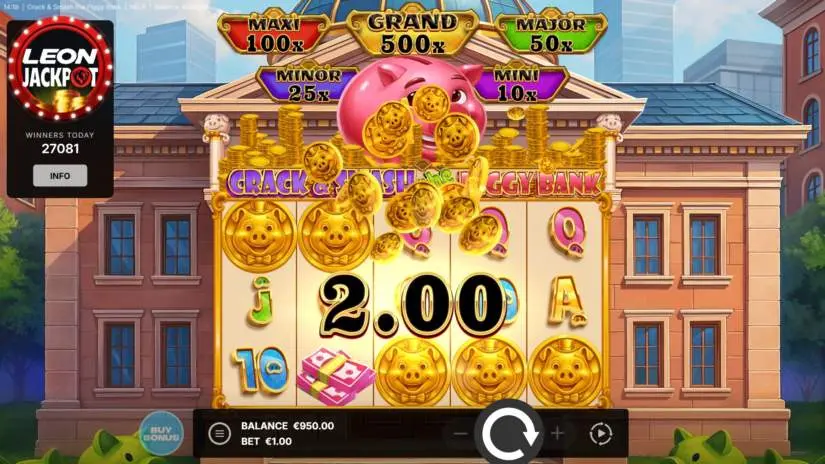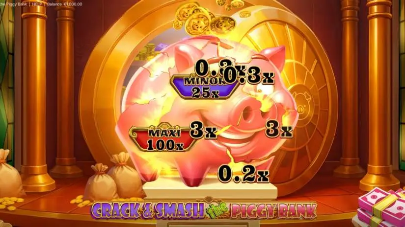 The game features 5 jackpots. When a jackpot appears from the piggy bank during the “Smash and Win” bonus, the corresponding prize is awarded.