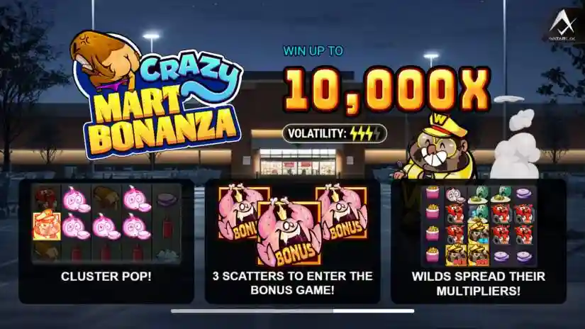 Crazy Mart Bonanza is a Cluster Pops game from Avatar UX where 5+ symbols of the same kind result in a win.