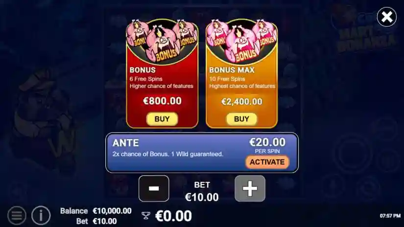 WILD Ante doubles your chances of triggering the bonus game and guarantees at least one Wild symbol landing on every spin.
