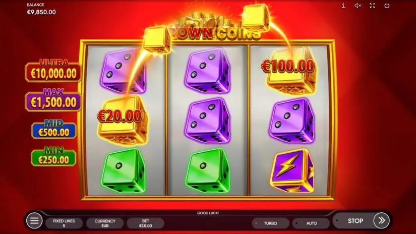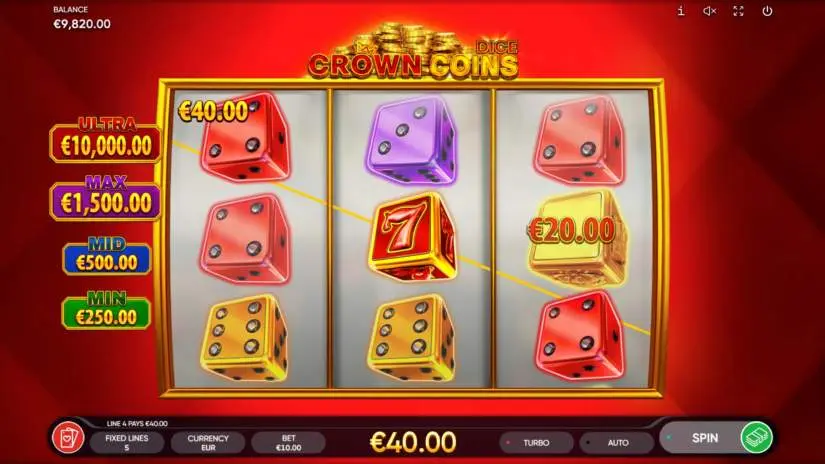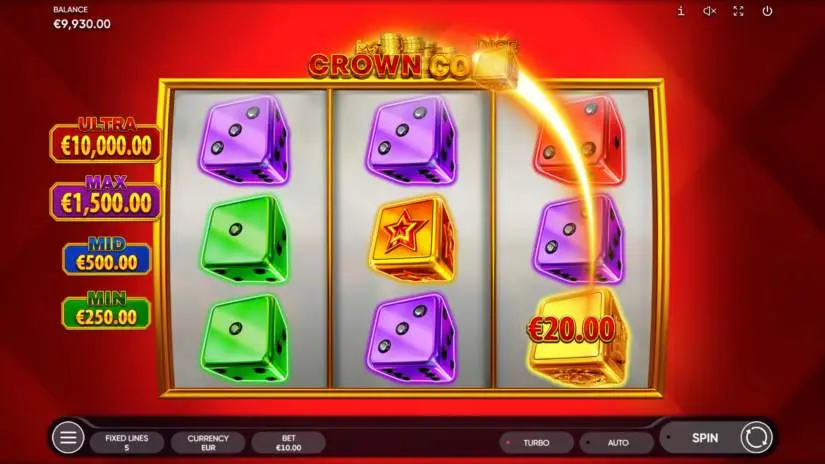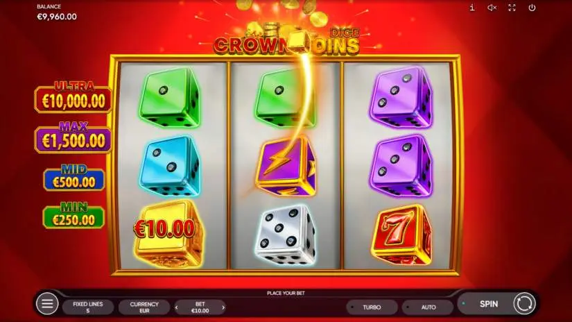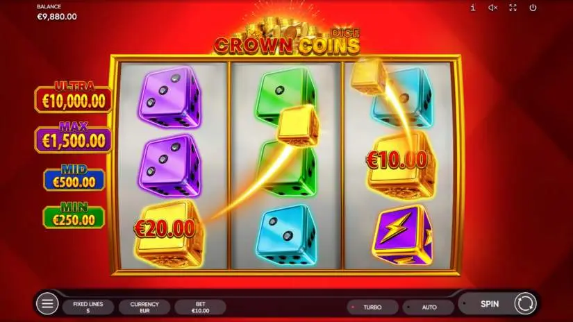 CROWN COINS DICE is a 3-reel, 3-row, and 5-payline slot from Endorphina. All prizes are awarded for matching combinations of symbols. Symbols must be on paylines and adjacent reels, starting with the leftmost one.