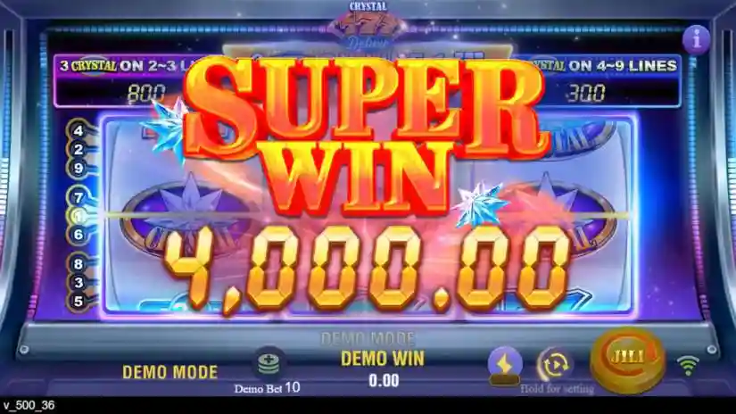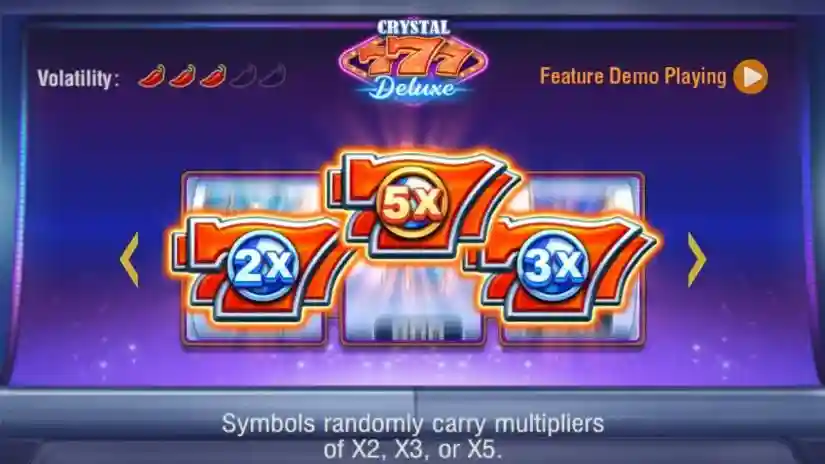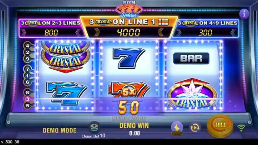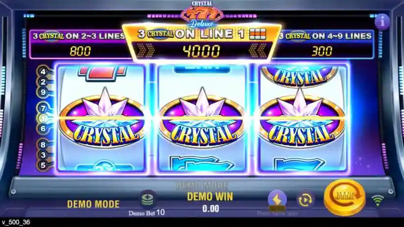 Crystal 777 DELUXE is a 3-reel, 3-row video slot. The number of paylines is fixed at 9. Winning combinations of identical symbols are paid out from the leftmost reel to the right on adjacent reels. Winning combinations and payouts are determined based on the paytable. Only the highest win on each payline is paid out. All winning combinations on multiple paylines are summed up and added to the total win. Winning combinations and payouts are determined according to the paytable.