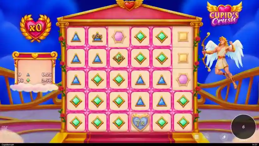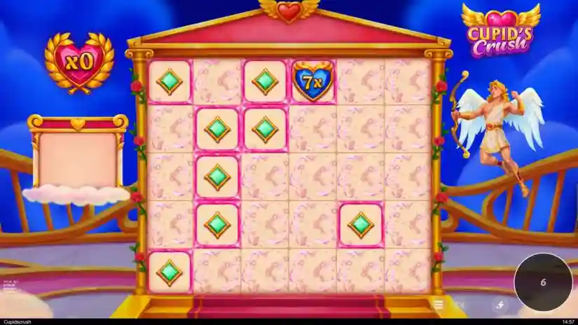 The maximum win in Cupid’s Crush is capped at 5,000 times your bet. Reaching this limit immediately ends the feature, and your winnings will be credited. If the limit is reached during free spins and/or other bonus features, the feature ends, and any remaining free spins and/or bonus features will be forfeited.