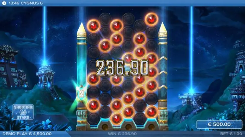 When Cygnus Drops ends, all Mystery and Premium Mystery symbols transform into a random payout symbol. The win is then assessed, after which the round ends. If both feature symbols are activated in the same drop, the Multiplier symbols trigger first, rather than the Star Igniter.