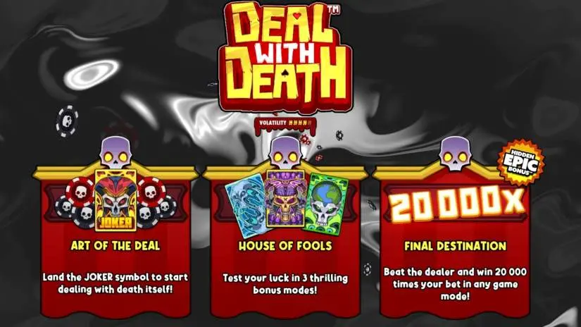 Deal With Death by Hacksaw Gaming plays on a 5-reel, 4-row grid with paylines and poker-style wins. The maximum win is 20,000x your bet and can be achieved in any mode! The maximum win is possible in all modes except Classic!