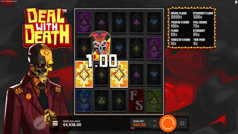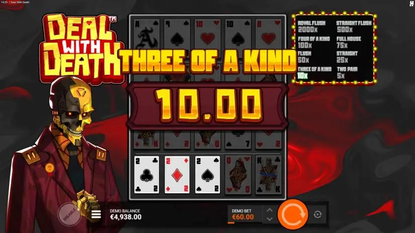 The deal is made, and the reels spin. Deal With Death is a game with two sides: luck and fate. Spin the reels in classic mode or land the JOKER symbol to enter Poker mode, where the symbols turn into playing cards, and each line becomes a poker hand!