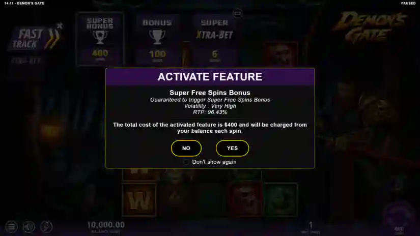 Fast Track provides direct access to game features. Fast Track features can only be activated in the main game. All game rules apply to Fast Track. When Fast Track is activated, each spin will have a fixed cost based on the current bet level and the selected feature. The cost is deducted for each spin while Fast Track is active. Fast Track will remain active until you deactivate it by tapping the feature icon.