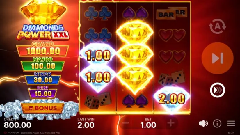 The Diamonds Power feature collects all Bonus symbol values, including Mini, Minor, Major, and Grand Jackpot symbols, and adds them to the spin win in the Main Game or the Total Win in the Bonus Game.